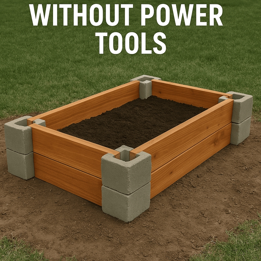 A raised bed built with wall blocks and natural wood—no screws, no drills, no problem.